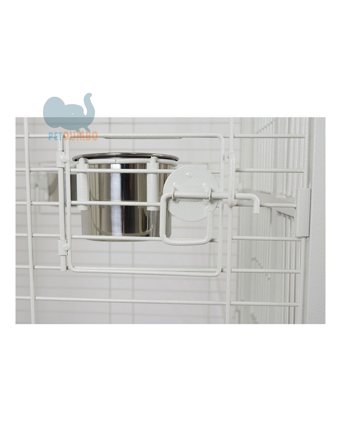 La gabbia è dotata di posatoi in legno e di 3 ciotole in acciaio da 10 cm di diametro, che vanno poste in appositi alloggiamenti con sistema antiribaltamento.